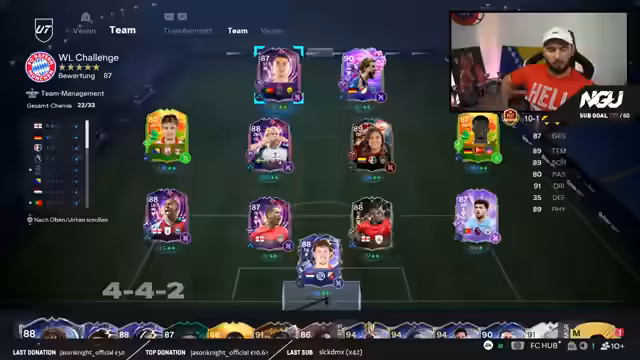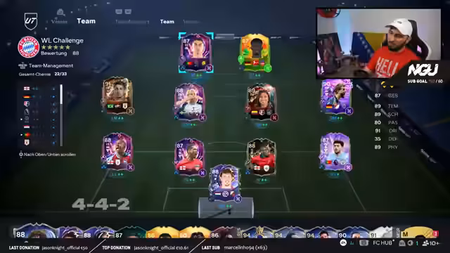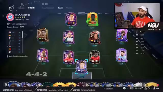 01:40:28Die eigentliche Weekend League Challenge wird vorgestellt: Das Ziel ist es, mit einem komplett neu zusammengestellten Evo-Team, das der Streamer zuvor nie gespielt hat, so viele Siege wie möglich zu erzielen. Für jeden Meilenstein, wie z.B. 10, 11 oder 12 Siege, wird ein Giveaway für die Zuschauer ausgelöst, was den Anreiz für beide Seiten erhöht.