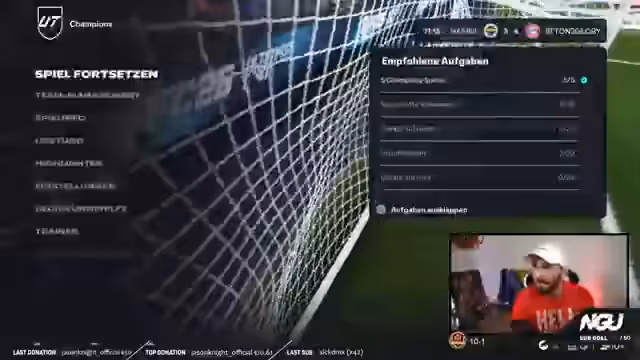 01:10:00Nach zwei gespielten Spielen und einem zu Null hält der Streamer fest, dass die Challenge schwieriger ist als erwartet. Die Serverprobleme und die Schwäche des Torwarts machen die Bedingung 'vier Spiele zu Null' sehr fordernd. Es wird bereits angedeutet, dass die Challenge-Bedingungen in Zukunft eventuell angepasst werden könnten, um realistischere Ziele zu schaffen.