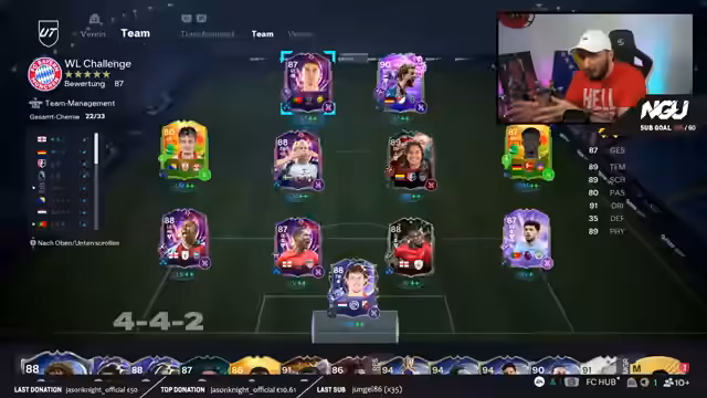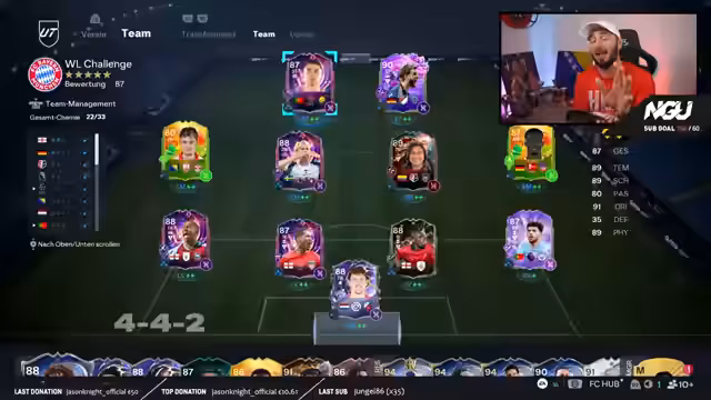 04:19:31Der Streamer erläutert das neue Konzept der wöchentlichen Weekend League Challenges. Jeden Freitag wird ein neues, bewusst schwaches Team zusammengestellt, um den Spielspaß und die Motivation zurückzugewinnen. Das Ziel für jede Challenge ist festgelegt, wobei ein Sieg meist ausreicht, um die Herausforderung für die Community zu bestehen. Dieses Format soll ihm helfen, wieder mit mehr Fokus und Freude zu spielen, wie es in der aktuellen Challenge offensichtlich gelungen ist.