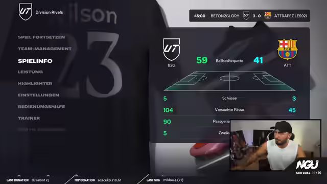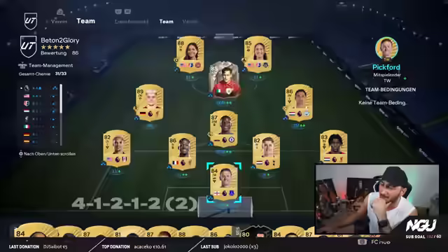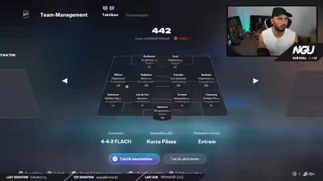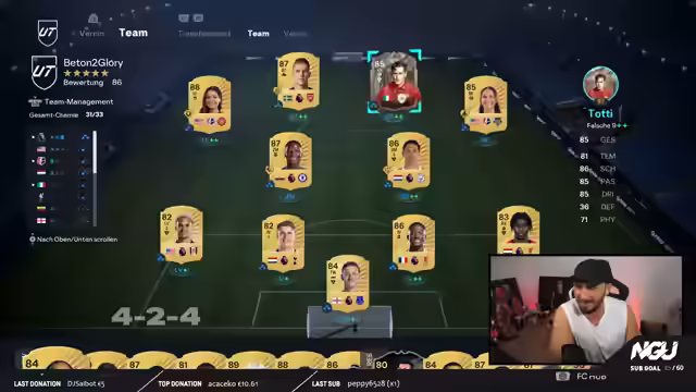 01:59:26Es wird festgestellt, dass Totti auf der ZOM-Position besser funktioniert und Sofia vorne besser eingesetzt werden kann. Die Taktik wird angepasst, um eine stabilere Basis zu schaffen und nicht ständig überlaufen zu werden. Es wird betont, wie wichtig es ist, hinten betont zu spielen, besonders bei schlechter Verbindung. Der Streamer spricht offen über seine Investitionen in das Spiel und betont, dass Transparenz wichtig ist. Er weist darauf hin, dass er als Selbstständiger die Ausgaben steuerlich absetzen kann. Die aktuelle Taktik wird gelobt und es wird erwähnt, dass sie gut funktioniert, besonders das Betonen der Defensive. Es wird die Bedeutung des Zurücklaufens und des Beton Verteidigens betont. Totti auf ZOM wird als Gamechanger hervorgehoben. Nach zwei guten Spielen mit der neuen Taktik wird die Bedeutung der richtigen Taktik in FIFA betont, um hinten kompakt zu stehen und Konter zu vermeiden. Es wird die aktuelle Taktik gezeigt und erklärt, dass es dieses Jahr keine RTG (Road to Glory) gibt, sondern zwei Accounts: einen Main Account und einen RTG Account.