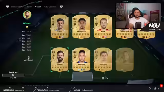 02:01:00Nach den Pack-Öffnungen wechselt der Fokus zur Teamentwicklung. Der Streamer beginnt, den Torhüter Onana live zu evolvieren, um ihn zum Team of the Year zu machen. Es werden die notwendigen Aufgaben in Squad Battles und Rivals angedeutet. Gleichzeitig kündigt er an, dass er morgen einen riesigen Stream mit den besten Packs des Main-Accounts plant, bei dem er einen TOTI ziehen wird, um die Serie der Peches abzuschließen.