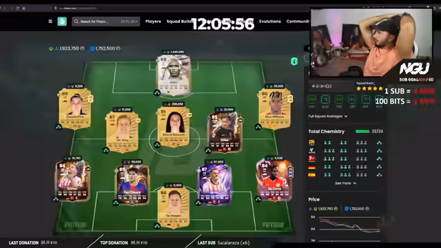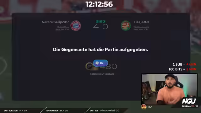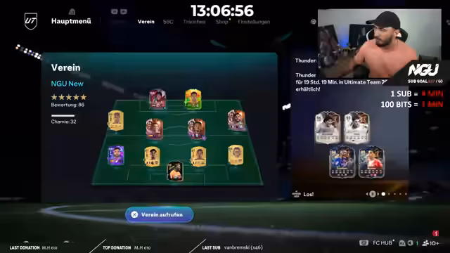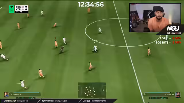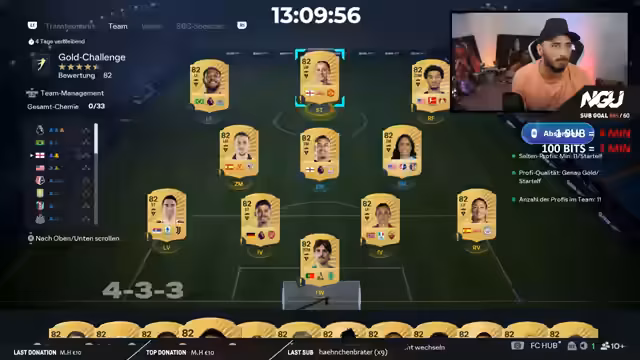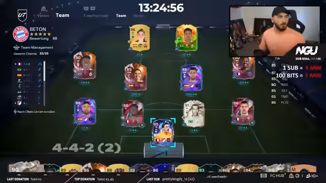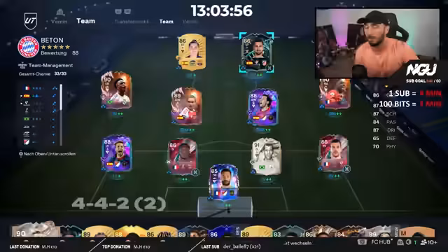 02:30:03Nach einem weiteren Sieg plant der Streamer, endlich in die Division Rivals-Spiele einzusteigen. Er äußert den Wunsch, heute intensiv Rivals zu spielen und sein Team, bestehend aus Pina und Baena im Sturm, sowie Orson, Winnie und Dembélé im Mittelfeld, ausgiebig zu testen. Er ist jedoch unzufrieden mit der aktuellen Serverleistung, die er als „kackegrad“ empfindet. Zudem erwähnt er eine anstehende Wette bezüglich der Scorerpunkte von Baena in dessen Debüt-Spiel. Er erinnert sich an seine Zeit bei Bibald und bedankt sich bei Don Bosco für die Unterstützung, die den Subathon-Timer über 12 Stunden hält. Er blickt gespannt auf die kommenden Stunden des Streams.