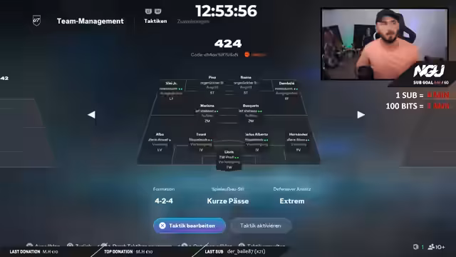 06:14:42Der Streamer präsentiert seine neuesten Afterpatch-Taktiken, da viele Zuschauer danach gefragt haben. Er hat fünf verschiedene Taktiken, darunter eine Offensiv-Taktik für Rückstände, normale Taktiken zum Wechseln und seine „Monster-Rote“. Er betont, dass die Zuschauer die Taktiken finden sollen, die am besten zu ihnen passen, und dass diese Präsentation auch auf YouTube verfügbar sein wird. Der NGU Subathon läuft täglich von 18 Uhr bis 3 Uhr morgens auf YouTube und Twitch. Er beginnt mit der 4-4-2-Taktik, die seine absolute Haupttaktik ist und sich nach dem Patch als extrem gut erwiesen hat, sowohl defensiv kompakt als auch flexibel in der Offensive über Flügel und Mitte. Er verwendet immer noch eine Tiefe von 55, plant aber, in Zukunft auch höhere Tiefen wie 70 oder 90 auszuprobieren, da aktiveres Verteidigen seit dem letzten Patch wichtiger geworden ist.