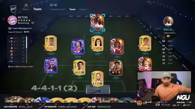 01:46:57Der Streamer testet verschiedene Taktiken, darunter 4-4-1-1, 4-2-3-1 und die Monsterroute, um die beste Formation für sein Team zu finden. Er bemerkt Schwächen in der 4-4-1-1 auf dem Hauptaccount, wo sich das Team weniger selbstverständlich im Angriff bewegt. Nach einigen Fehlern beim Dribbeln entscheidet er sich für eine passorientierte Spielweise und stellt fest, dass die Gegner durch konsequentes Passspiel aus dem Gleichgewicht zu bringen sind.