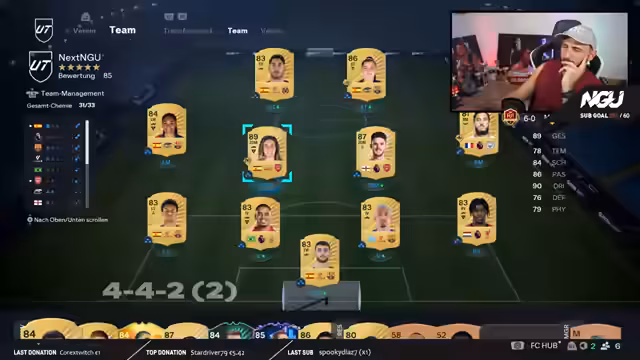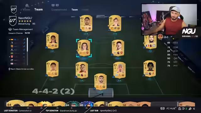 11:00:27Ein Zuschauer erhält eine detaillierte Analyse seiner 4-4-2-Taktik im FUT Weekend-League-Modus. Der Streamer lobt die Stärke der Formation und gibt speziell für das 2-on-2-Format wertvolle Tipps. Es werden mechanische Anweisungen erklärt, wie der Gegner im Rivals-Modus eingeladen wird, und taktische Feinheiten besprochen, um defensiv kompakt zu agieren und den Ball sicher aufzubauen.