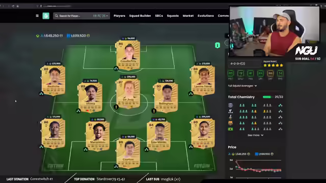 11:45:00Es wird über die Cornerstones-Evo diskutiert und überlegt, welchen Spieler man dort am besten einsetzen könnte. Der Streamer erklärt, dass er 750 Euro in den Main-Account investiert hat. Es wird überlegt, ob man die Cornerstones-Evo auf Flashback Goretzka packen soll. Der Streamer erklärt, dass Kryzen safe sein wird, wenn die Cornerstones-Evo immer bleibt. Er erklärt, wie die Chemie durch die Cornerstones-Evo funktioniert. Er erklärt, dass Kryzen in sein Squad auf jeden Fall kommt, weil er LM spielen kann und somit universell einsetzbar ist. Er überlegt, was er auf dem Main-Account macht, da die eine Evo für Kryzen wahrscheinlich wegfällt. Er überlegt, ob er zwei verschiedene Spieler reinpacken kann. Er fragt die Community nach Ideen, wen man auf dem Main-Account nehmen könnte. Bergwall wird als mögliche Option genannt, aber passt nicht in die Kombo. Es wird über Theo Hernandez diskutiert. Der Streamer kündigt an, am Sonntag RTG und Montag Main zu spielen. Er macht ein Foto für Foodpill und fragt nach Trending Players. Er erklärt, dass Kryzen für ihn der geilste ist und er bei den anderen einfach ausfallen lässt.