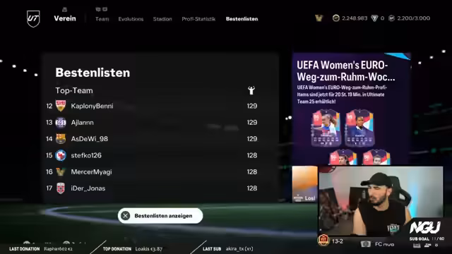 01:42:56Er beginnt mit dem Season Pass-Grind, aktiviert Ziele und gibt 500k aus. Wechselt auf einen anderen Account, um denselben Prozess zu wiederholen. Danach startet er ein Spiel im UEFA Women's Euro-Modus. Währenddessen treten erhebliche technische Probleme auf, der Stream stockt oder hängt vollständig. Er testet verschiedene Lösungsansätze, wie das Öffnen neuer Tabs, und bittet die Zuschauer um Feedback, um das Problem zu diagnostizieren.