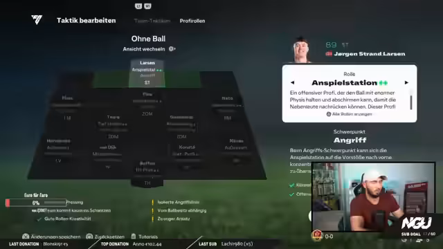 00:49:24Der Streamer testet erstmals die 4-2-3-1-Formation anstelle seiner gewohnten 4-4-1-1 und vergleicht sie. Er beschreibt sie als defensiver im Spielaufbau, aber auch variabler in der Offensive. Ein großes Augenmerk liegt auf dem neuen 'R2-Boost', einem Sprintmechanismus, der seit dem Patch sehr effektiv ist. Durch zeitiges Wegsprinten, wenn der Gegner sich bewegt, kann man ihn leicht umgehen. Diese Technik wird mit den neuen Pace-Eigungen der Spieler als extrem wirkungsvoll und gefährlich angesehen, was im TOTY-Stream zu neuen Taktiken führen wird.