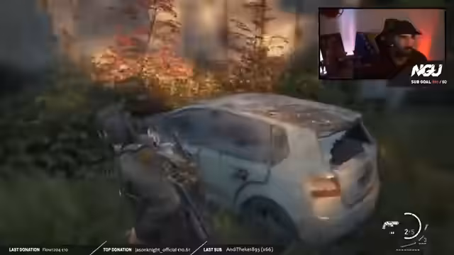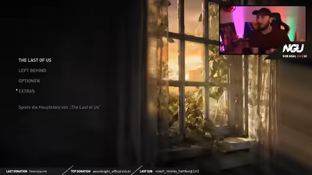 02:51:13Der Stream beginnt offiziell mit der fünften Nacht von The Last of Us. Die Story wird fortgesetzt: Joel und Ellie haben sich nach einem Streit wieder mit Tommys Hilfe zusammengefunden. Gemeinsam brechen sie auf, um den Weg zu den Fireflies fortzusetzen. Der Streamer ist hochmotiviert und euphorisch, wieder in das Spiel einzutauchen und die spannende Atmosphäre der Nacht gemeinsam mit der Community zu erleben.