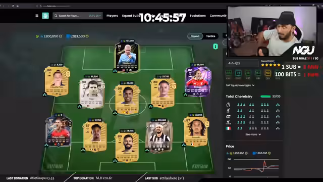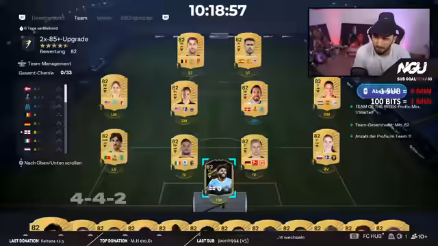 03:48:08Der Streamer bittet seine Zuschauer, ihre FIFA-Teams über spezifische Webseiten zu erstellen und ihm die Links zuzusenden. Er beginnt mit der Bewertung der eingereichten Teams, analysiert deren Stärken und Schwächen, schlägt Spielerwechsel vor und bewertet die Teamchemie. Diese Phase ist stark von der interaktiven Einbindung der Community geprägt, während er auf das Eintreffen weiterer Teams wartet und parallel dazu seinen Subathon-Zielstrang vorantreibt.