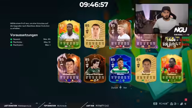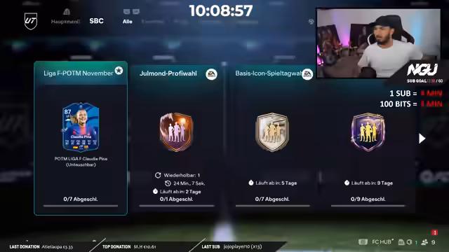 Während des neunten Tages des Subathons wurde der Fokus auf die Pina SBC gelegt. Es wurde ihre Integration ins Team besprochen und eine Evolution zur 85er-Karte erfolgreich abgeschlossen. Der anschließende Gameplay-Test im 4-4-2-System bestätigte ihre hohe Effektivität im Spielaufbau. Auch für die Abendstunden wurde ein abwechslungsreiches Programm angekündigt.