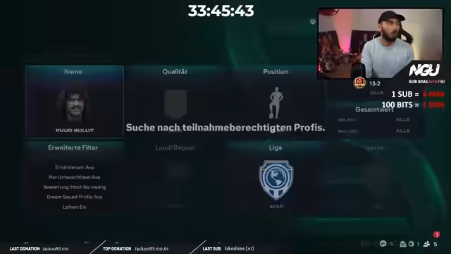 00:32:29Vor dem Pack Opening plant der Streamer Wetten mit seinem Teamkollegen Lucky. Sie diskutieren, wie Wetten funktionieren: Zum Beispiel, ob der nächste Walkout links- oder rechtsfüßig ist oder ob er bestimmte Playstyles wie Tiki-Taka hat. Der Streamer betont, dass Wetten erst nach ihrer Aktivierung gültig sind und er öffnet zunächst einige kleinere Packs zur Vorfreude.