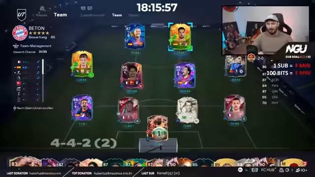 02:08:36Nach anfänglichen Schwierigkeiten und zu vielen Fehlpässen entscheidet sich der Streamer, das Team taktisch umzustellen. Er wechselt von der 4-4-2 zu einer 4-2-3-1-Formation, die als Übergang zur beabsichtigten 'Monster-Taktik' dient. Parallel wird das Flachschuss-Playstyle wiederentdeckt und als effektiv angesehen, da es aus ungewöhnlichen Winkeln Tore ermöglicht und von der gegnerischen Abwehr schwer zu verteidigen ist. Diese Anpassungen sollen die Offensivstabilität erhöhen.