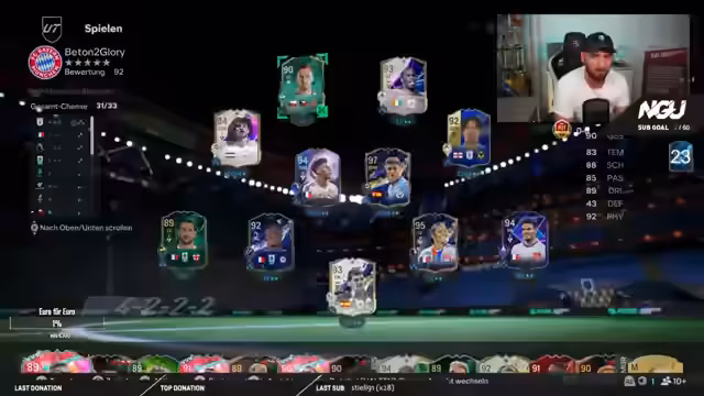 03:10:09Im Fokus steht nun der Test des Omega-Spielers. Der Streamer ist von dessen Statistiken beeindruckt: 1,95 Meter groß, Press Proven Plus, Raserei Plus, Flachschuss Plus und Fünf-Sterne-Schwachfuß. Er erwähnt, dass dem Spieler nur Ariel fehlt, was jedoch für seinen Stil in Ordnung sei. Nach positivem Feedback von Chat-Mitgliedern beschließt er, den Omega in sein Team aufzunehmen und erwähnt die Notwendigkeit, eine SBC mit 88er-Spielern und mehreren 86ern zu lösen.