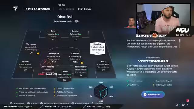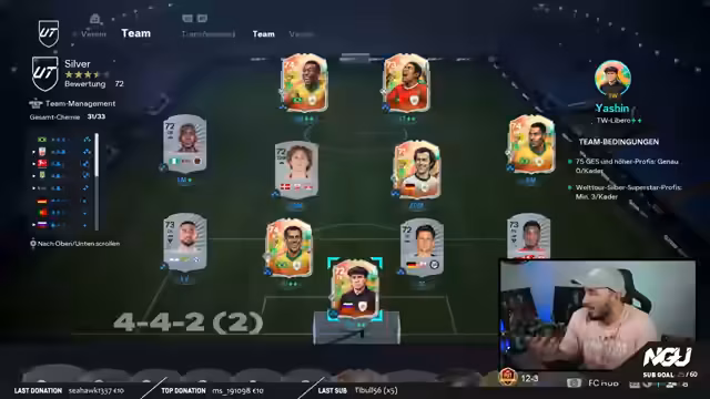 00:31:52Der Streamer stellt den 'Silver Cup' vor, ein In-Game-Turnier, das er im aktuellen Stream spielen wird. Dieses Turnier erfordert den Einsatz von mindestens drei Silber-Icons, die zuvor erspielt wurden. Er erklärt sein aktuelles Team-Setup, das Pelé, Eusebio, Jairzinho, Carlos Alberto, Beckenbauer und Yashin im Tor umfasst. Für das Spiel im Silver Cup plant er eine 4-4-2-Formation. Die Ziele im Silver Cup sind 20 Siege und 25 erzielte Tore bei 30 Versuchen, was als machbar eingeschätzt wird. Er fragt die Community nach ihren Erfahrungen mit dem Silver Cup und ihren bisherigen Erfolgen, um den Austausch zu fördern und Tipps zu sammeln.