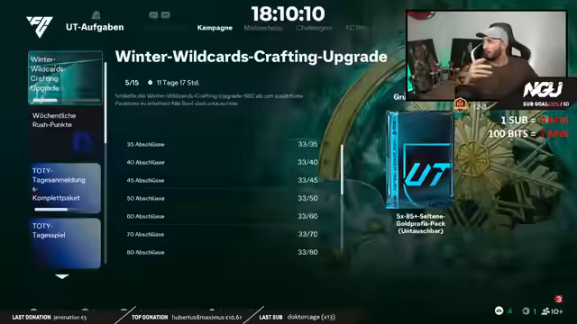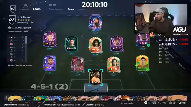 00:10:05Der Streamer begrüßt alle zum 46. Tag des NGU Subathons und zum zweiten Team of the Year-Tag. Er hofft, dass allen gut geht und betont die Bedeutung des heutigen Tages für große Pack-Öffnungen und spezielle Evolutions. Die Community wird im Chat aktiv nach der Teilnahme gefragt und bekannte Nutzernamen werden genannt, während er auf die Notwendigkeit hinweist, Likes auf YouTube für den Algorithmus zu erzeugen und zur Seite auf Twitch zu wechseln.
