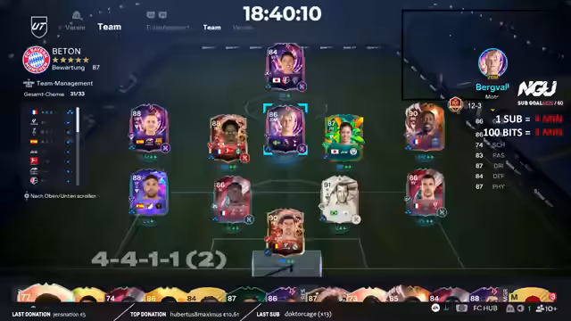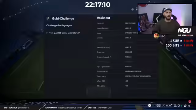 04:20:42Der Streamer ist im 46. Tag seines NGU-Subathons und grindet weiterhin bis 3 Uhr morgens. Er hat noch viele Packs auf einem zweiten Account und plant, diese zu öffnen. Ein Fokus liegt auf der Vorbereitung des SBCs für Sophia, die er mit Evolutions aufwerten will. Er appelliert an die Community, auf YouTube zu liken, um die 100er-Marke zu erreichen, und erwähnt, dass jeder Prime-Sub die Streamzeit um 4 Minuten verlängert.