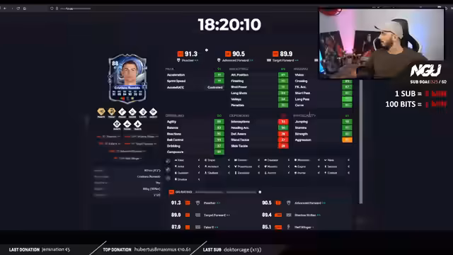 01:00:06Um 19 Uhr wird eine neue Evolution für Stürmer (86er OVR, maximal 5 Positionen) vorgestellt. Der Streamer erkennt, dass Brian Lasme ideal dafür passt, um weitere Pace-Verbesserungen zu erhalten. Es folgt eine detaillierte Diskussion über die Möglichkeit, Cristiano Ronaldo in eine Kombination aus zwei Evolutions (Jungbrunnen und einer Sturm-Evolution) zu stecken, um ihn mit Playstyles wie Quickstep und Finesse Plus auszustatten. Die Attraktivität eines erstellten 95-OVR-Ronaldo wird ausführlich bewertet.