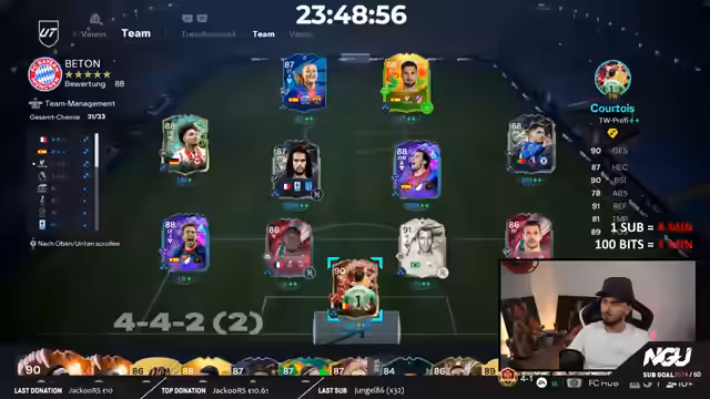 00:21:22Für die heutige Weekend League stellt der Streamer sein Hauptteam vor, bestehend aus Maradona, Pina, Baena, Netto und Gündo Si. Er ist zuversichtlich, da er das beste Gameplay des Jahres spielt und eine Taktik einsetzt, die gegen 85% der Gegner erfolgreich ist. Er wechselt zwischen einer Standard 4-4-2-Formation und einer defensiveren 4-4-1-1, die er nur bei schwierigen Gegnern nutzt. Er erwähnt zudem die neuen Positionen-Kaufoptionen im Spiel, die er als Erneuerung betrachtet, da sie mehr Flexibilität bieten.
