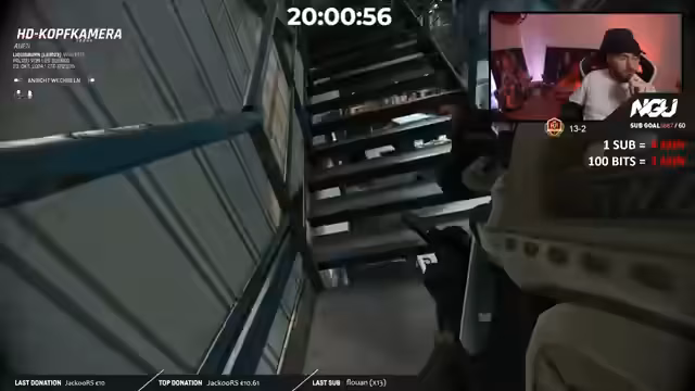 08:03:17Der Streamer setzt den Angriff fort und sichtet einen Geiselnehmer, der eine Person gefangen hält. Er berichtet über einen missglückten Versuch, den Feind zu eliminieren, und beschreibt die chaotische Situation im Raum. Er berichtet schließlich über den Erfolg, indem er zwei Gegner ausschaltet, und sucht nun nach weiteren Gegnern in den umliegenden Bereichen.