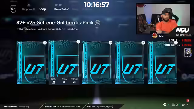 01:46:36Der Streamer verkündet seinen bemerkenswerten Erfolg im Ziehen von Team of the Year-Karten. Er berichtet, dass er in diesem Jahr sieben Karten aus eigenen gegrindeten Packs gezogen hat, im Gegensatz zu den Vorjahren, in denen er meist nur eine Karte pro Jahr erhielt. Er teilt seine Strategie, das gesamte Jahr über intensiv zu grinden und Crafting-Packs zu öffnen, und kündigt an, im weiteren Verlauf des Streams nochmals Shop-Packs für 200 Euro zu öffnen, um den letzten Tag seines Grinds erfolgreich abzuschließen.