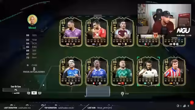 02:30:22Nach einer intensiven Diskussion über die optimalen Spieler für sein Team, kommt der Streamer zu dem Schluss, dass CDB die eindeutig beste Wahl ist und er sich mit dieser Karte sehr zufrieden zeigt. Das Pack Opening endet, aber der Streamer kündigt weitere Pläne an, wie das Öffnen eines 5x90er Packs in der nächsten Woche und die Teilnahme am DFB-E-Pokal-Stream am Sonntag, um die finale Entscheidung über das Team zu treffen.