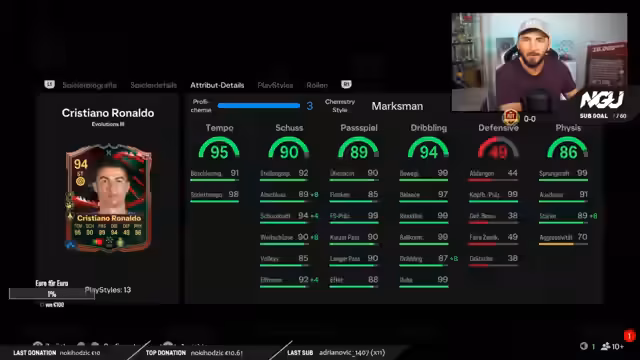 00:13:30Der Stream beginnt mit der Begrüßung der Community und der Vorstellung des Teams. Der Hauptfokus liegt auf dem Debüt der neuen Cristiano Ronaldo Evo, die als die beste der Welt präsentiert wird. Der Streamer hebt die herausragenden Eigenschaften der Karte hervor, insbesondere die 99 Beweglichkeit, 98 Sprintgeschwindigkeit und 97 Balance, die sie zu einem absoluten Top-Stürmer machen. Er betont, dass er mit der Karte noch kein einziges Spiel gemacht hat, um das Erlebnis gemeinsam mit der Community zu teilen und die tatsächliche Performance in der Weekend League zu testen.