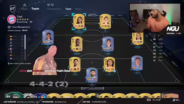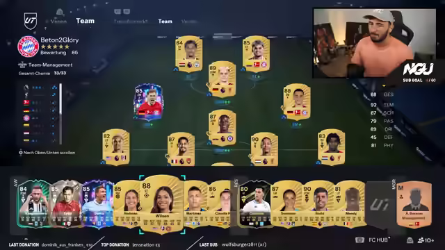 01:27:13Der Streamer startet mit einem neuen FIFA-Team und bittet die Zuschauer um eine Bewertung, wobei er humorvoll auf die teils harschen Urteile eingeht. Es folgt eine Diskussion über die aktuelle Meta des Spiels, insbesondere den Einsatz von Frauenteams. Er berichtet von seinen Erfahrungen, von Frauenteams "verprügelt" worden zu sein und erklärt, dass er eigentlich keine vielen Frauen im Team haben will, aber die Meta sich verändert hat. Er spricht über bestimmte Spielerinnen wie Dumornay, Paraluejo und Pina, die ihm im Spiel Schwierigkeiten bereitet haben. Er bedankt sich bei Zuschauern für Resubs und geht auf Kommentare im Chat ein, unter anderem bezüglich des Spielers Hincapi.