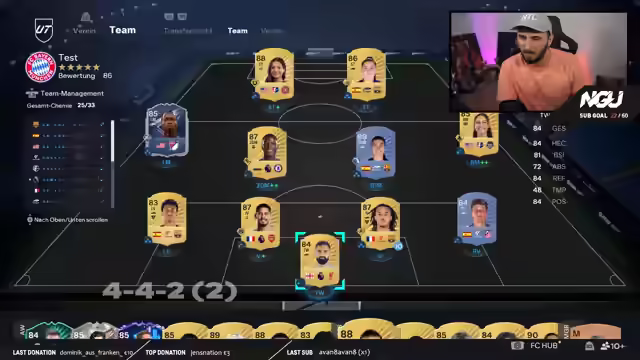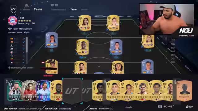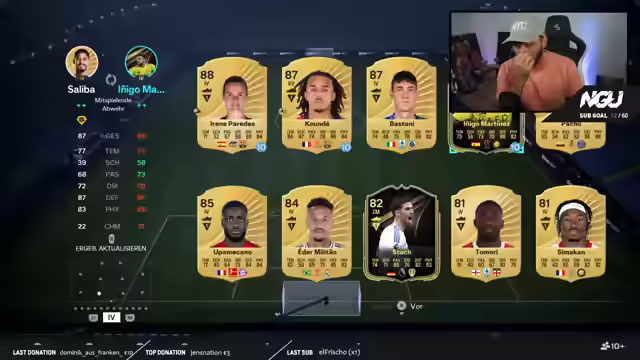 01:30:41Es wird über den Kauf des Spielers Kunde diskutiert und überlegt, ob er die hohen Kosten wert ist. Der Streamer plant, Kunde zunächst per Leihkarte zu testen. Um den Kauf zu finanzieren, werden die Spieler Musiala und Wirz verkauft, wobei der Streamer sogar Profit macht. Er bezeichnet sich selbstironisch als "number one Trader of all time". Es wird kurz auf den Gauntlet Cup eingegangen und gefragt, wer ihn bereits gespielt hat. Der Streamer gibt Einblicke in seine aktuelle Liga (Liga 4) und seine Strategie, zwei Accounts parallel zu führen. Er erklärt seine aktuelle Taktik (Raute) und verweist auf ein YouTube-Video mit einer detaillierten Erklärung. Es wird überlegt, ob der Spieler Lamin ins Team passt und die Community wird nach ihrer Meinung gefragt. Der Streamer testet den Spieler Koundé per Leihkarte und schließt den Spieler Miet kategorisch aus seinem Team aus.
