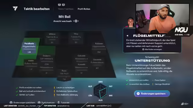 02:49:14Es wird über die Trägheit des Gameplays diskutiert, die Tiki-Taka erschwert, im Gegensatz zum schnelleren Gameplay des Vortags. Der Streamer erwähnt seine Taktiken, einschließlich einer 'Monstertaktik' mit zwei Stürmern, und testet verschiedene Varianten, um die beste Balance zwischen Offensive und Defensive zu finden. Er nimmt Goretzka als Einwechselspieler in sein Team auf und testet Lamin auf dem rechten Flügel, wobei er die Bedeutung von Ausdauer und die Stärke von Lorente hervorhebt. Abschließend kündigt er an, am Wochenende die Weekend League zu streamen, mit einem geplanten 12-Stunden-Special-Stream am Freitag, bei dem die Weekend League im Mittelpunkt stehen wird.