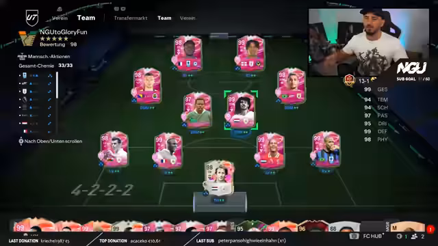 02:45:21Es wird die Wertschätzung für die Zuschauer und deren Unterstützung ausgedrückt, besonders während einer schwierigen Phase. Es wird betont, wie wichtig die Unterstützung für den Wiederaufbau des YouTube-Kanals ist und dass ein "wahnsinnig geiles Jahr" mit viel Output bevorsteht, wobei die Zuschauer eine entscheidende Rolle spielen. Es wird auf ein Team verwiesen, das gemeinsam etwas erreichen will. Es wird kurz auf das Spiel eingegangen, wobei Spielernamen wie Pina und Vasil genannt werden. Es wird überlegt, ein günstiges, aber starkes Team zusammenzustellen, ein sogenanntes FC Wilharden-Squad. Dabei werden verschiedene Spieleroptionen diskutiert, darunter Adeyemi und Kubo, wobei der Fokus auf günstigen, aber effektiven Spielern liegt. Es wird überlegt, wie man Spieler wie Rafa am besten in das Team integriert und gleichzeitig die Chemie optimiert. Verschiedene Liga-Optionen werden in Betracht gezogen, darunter die portugiesische und türkische Liga, um die bestmögliche Kombination zu finden. Es wird überlegt, ob man auf bestimmte Ligen verzichten soll, um die Teamchemie zu verbessern. Spieler wie Maeda werden als unverzichtbar angesehen, während andere Positionen flexibler gestaltet werden sollen.