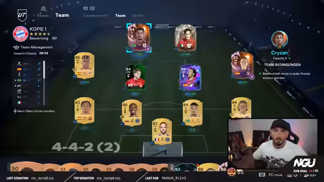 04:16:45Der Streamer kündigt an, sein Haupt-Team aufgrund von Unzufriedenheit mit der aktuellen Konstellation anzupassen. Spieler wie Kimmich und Totti sollen das verlassen, während Nico Williams und Baena ins Team kommen sollen. Er hofft auf Glück beim Pack Opening und möchte nicht zu viel Geld investieren, sondern auf Black Friday warten. Der Streamer vergleicht Spieler und sucht nach der idealen Kombination für seinen Spielstil. Er zeigt auch seine Chemie-Werte und erklärt seine Strategie für Team-Upgrades.