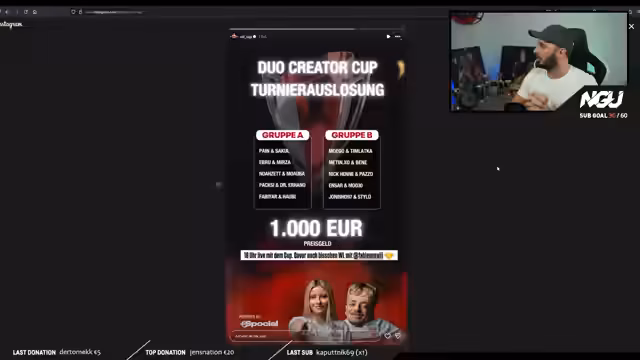 00:10:16Nach einem aufregenden Stream am Vortag begrüßt der Streamer seine Zuschauer und gibt die Ankündigung für ein bevorstehendes Turnier. Gegen 18 Uhr startet der „1000€ Duo Creator Cup“ von Niki und Fabienne. Es handelt sich um ein Duo-Turnier mit 20 Teilnehmern, bestehend aus 10 Schwitzern und 10 Content Creators, wobei auch bekannte Profispieler wie Mo Auba und Saar Cool teilnehmen. Der Streamer betont, dass er sich selbst als Content Creator und Underdog in diesem starken Feld sieht.