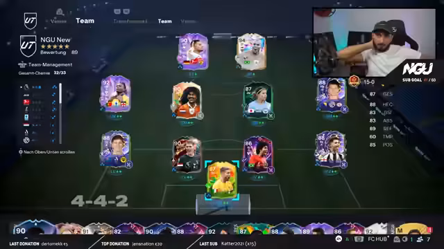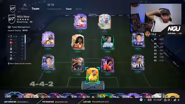 00:40:32Nachdem er seine Rivals-Spiele beendet hat, beleuchtet der Streamer die genauen Regeln des Turniers. Es wird auf der PS5 in Ultimate Team gespielt, mit der Auflage, dass mindestens ein Spieler der Startformation in der Vergangenheit für den VfB Stuttgart aktiv war. Die Gruppenphase hat fünf Spieltage, wobei die Top 4 Teams ins Viertelfinale einziehen. Das übergeordnete Ziel ist, nicht als Fünfter auszuscheiden. Die Strategie ist defensiv geprägt: Er will so wenig Gegentore wie kassieren und im Ballbesitz bleiben, um den Druck der starken Gegner auszusitzen.