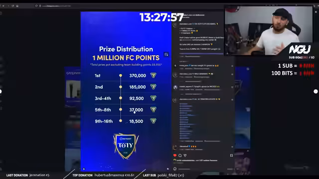 01:48:11Die Vorbereitungen für das Pack Opening laufen, wobei der Streamer bereits sein Team für den 1 Million Startselect TOTY Cup aufbaut. Ziel ist es, Spitzenpieler wie Messi und Cristiano auf verschiedenen Accounts zu holen. Wichtig ist die Ankündigung, dass der Partner und Organisator dieses Turniers Start Select in Zusammenarbeit mit Foot Bin ist. Für die Teilnahme an einem Giveaway kann der Befehl "Ausrufezeichen Giveaway" eingegeben werden, bei dem eine PlayStation, 50.000 FC Points und ein Footpin Hoodie gewonnen werden können.