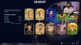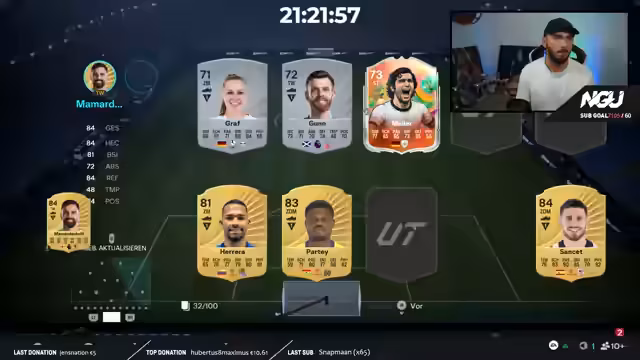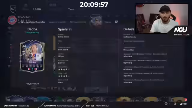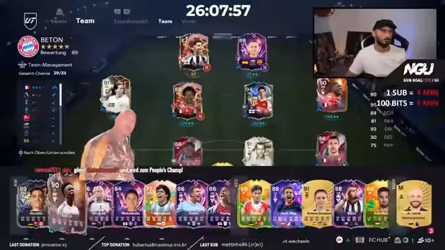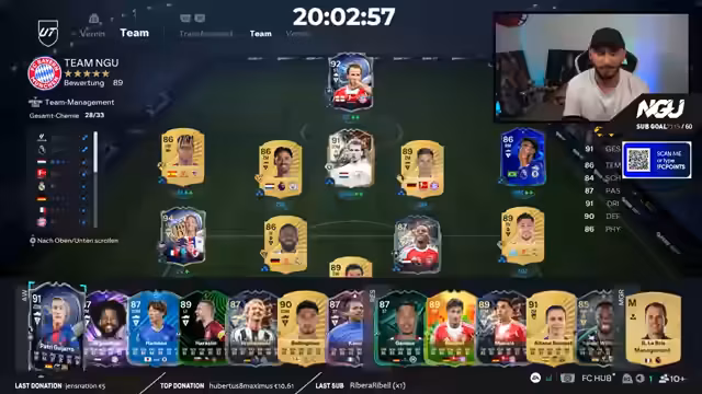 01:56:23Das Pack Opening beginnt unter Zeitdruck, da die Teams bis 20:30 Uhr erstellt werden müssen. Der Streamer öffnet verschiedene Packtypen, darunter Top Triefca Packs und Icon Packs, und zieht einige wichtige Spieler wie Patri, Rüdiger und Rodri. Aufgrund des Zeitmangels werden alle Spieler unter 86 OVR abgestoßen, was den Streamer emotional sehr belastet. Trotz des holprigen Starts gelingt es ihm, ein Team mit Schlüsselspielern wie Harry Kane und Patri zusammenzustellen. Die teuer gezogene Bacher-Karte wird als überaus stark beschrieben.