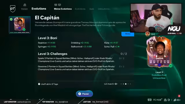 05:59:27Der Streamer spielt mehrere Runden im Rush-Modus mit Community-Mitgliedern wie Hannes und anderen aus dem 'Team Rush'. Er muss fünf Tore und fünf Vorlagen erzielen, um seine Ziele zu erreichen. Während der Spiele diskutiert er die Effektivität verschiedener Formationen und lobt die neue Evo, insbesondere die Karte von Baena, die durch die Evolution noch besser wird und als eine der krassesten Karten in der aktuellen Evo gilt. Trotz eines anfänglichen Sieges erlebt das Team Rush eine unerwartete Niederlage, nachdem sie eine 3:0-Führung verspielen. Dies führt zu einer humorvollen Selbstreflexion und der Entscheidung, eine weitere Runde zu spielen, um die Niederlage wiedergutzumachen und die fehlenden Tore und Vorlagen zu erzielen.
