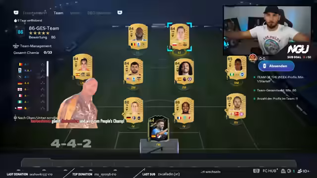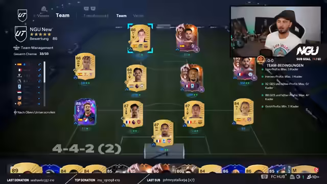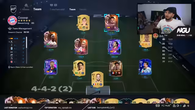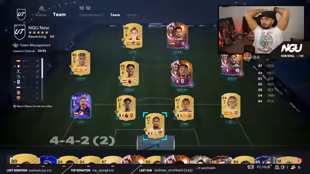 06:56:36Der Streamer beginnt mit der Bewertung von Zuschauer-Teams, die per Flüsternachricht auf Twitch eingereicht werden. Er analysiert ein Team mit Hernandez, Militao, Saliba, Lahm und Magnan in einer 4-4-1-1-Formation, die er als „geiles Meta-Squad“ lobt. Besonders hervorgehoben werden Thüram und Mariona im Mittelfeld sowie Nico Williams, Lamin, Fermin und Pina. Er erkennt, dass Fermin in die Musiala-Evo gepackt wurde und überlegt, ob ein Upgrade von Maignan von 87 auf 88 sinnvoll wäre, da der 88er eine bessere Reichweite hat. Die 4-4-1-1-Taktik wird als sehr effektiv beschrieben, insbesondere die Bewegung von Baena im freien Raum, obwohl er kein reiner ZOM ist. Eine weitere Teamanalyse zeigt ein zu defensives Team mit Busquets und Thüram in der Mitte, wobei der Streamer vorschlägt, Mariona statt Thüram einzusetzen und Busquets nach rechts zu verschieben, um offensiver zu spielen. Pina wird als immer noch bester Spieler gelobt, der bei der nächsten 86er Evo, in die sie passt, wieder explodieren wird. Die Kosten für Bonmati und Puteas werden diskutiert, und es wird überlegt, diese Spieler für den RTG-Account zu kaufen, jedoch mit der Erwartung, dass ihre Preise noch fallen werden.