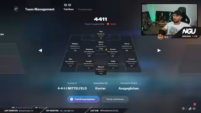 05:03:49Der Streamer startet sein erstes 2-gegen-2-Spiel mit einem Community-Mitglied namens Benni. Er spielt in Blau, Benni in Rot. Während des Spiels wird die Formation 4-5-1 verwendet. Der Streamer kommentiert die Taktik und die Spielweise, wobei er feststellt, dass das 4-5-1 per se eine sehr gute Aufteilung der Spieler bietet. Trotz guter Ansätze und viel Ballbesitz beklagt er das Pech und die Ineffizienz im Abschluss. Die Gegner hingegen setzen auf schnelle Konter und bunkern, was sich als effektiver erweist. Das Spiel endet unglücklich mit einer 0:3-Niederlage, was zu einer kritischen Reflexion über die Eignung der 4-5-1-Formation für 2-gegen-2-Matches führt, da zu viele Pässe und Ballbesitz zu Kontern führten.