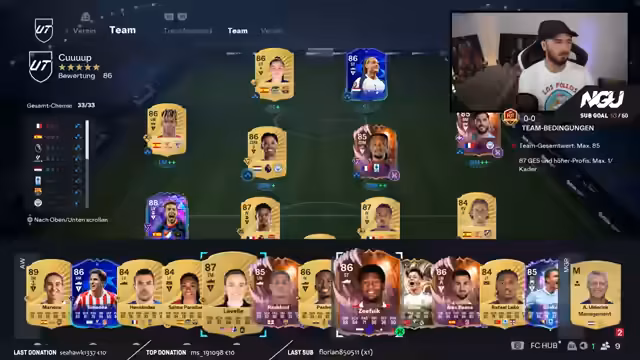 06:48:56Der Streamer diskutiert taktische Formationen, insbesondere die 4-4-1-1, die sich aktuell als sehr mächtig erweist. Er bewertet Spieler wie Zirkzee und Pina und überlegt, ob man diese halten oder verkaufen sollte, da die Preise fallen könnten. Es wird auch über technische Probleme mit Prime Sub gesprochen und wie man diese beheben kann. Die Diskussion dreht sich um die Effektivität von Spielern wie Mbappé, der trotz seines hohen Wertes manchmal nicht die gewünschte Leistung bringt. Der Streamer wechselt Zirkzee ein und Pina nach hinten, um die Defensive zu stärken. Eine Elfmeterentscheidung wird diskutiert, bei der der Streamer befürchtet, dass Dali den Ball lupfen könnte, was jedoch glücklicherweise nicht geschieht. Nach einem gewonnenen Spiel werden die Kampagnenaufgaben überprüft, insbesondere die 10 Siege, die für die Weekend League wichtig sind. Die Möglichkeit, die Weekend League noch am Sonntag und Montag zu spielen, wird erwähnt. Abschließend wird eine Teambewertung angeboten, bei der Zuschauer ihre Teams zur Analyse einreichen können.