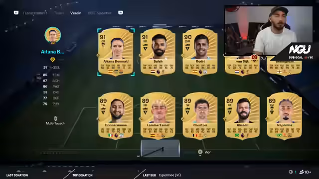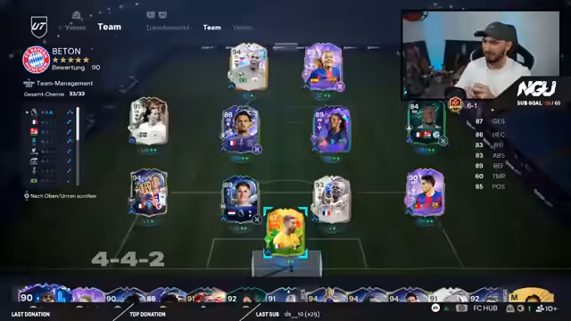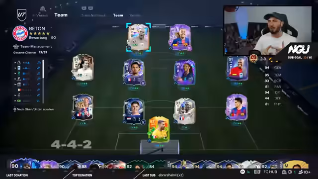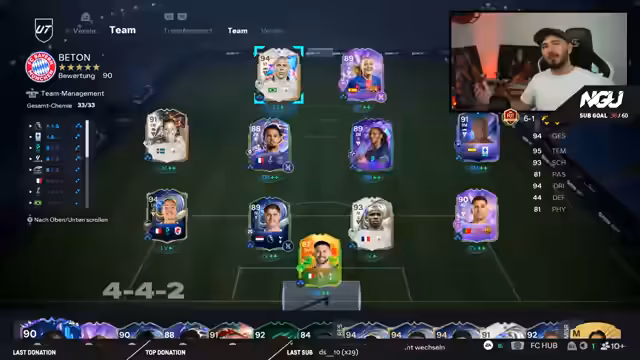 00:10:00Vor dem Start der Weekend League wird die aktuelle Taktik, ein 4-4-2-System, vorgestellt und diskutiert. Es werden Spieler analysiert, die an Position wie Stürmer im 2-Millionen-Bereich geeignet sind. Besonderes Augenmerk liegt auf der Nutzung von Birthday-Spielern und Evolution-Spieler, wie Pina, die ohne hohe Investitionen stark sind. Der Streamer erklärt die Vorzüge bestimmter Eigenschaften, wie Meter und Quirligkeit, und stellt sein aktuelles Team zusammen, um die optimale Leistung für die kommenden Spiele zu erzielen.