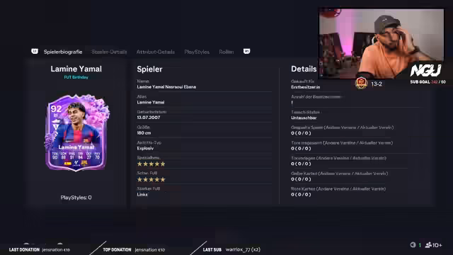 03:28:37Nach zahlreichen enttäuschenden Pack-Openings, insbesondere bei den 1483er-Packs, wird ein SBC "1 von 3, 89 plus für Birthday Team 1" absolviert. Trotz geringer Erwartungen wird der Top-Spieler Lamine Yamal mit einem Marktwert von 4 Millionen Münzen gezogen. Dies löst große Freude aus und der Streamer zeigt sich begeistert. Die zukünftige Verwendung von Yamal wird thematisiert, unter der Frage, welche Pace-Styles ihm gegeben werden sollen und ob er in der nächsten Weekend League gespielt wird.