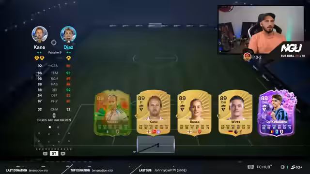 03:00:31Der Stream beginnt mit dem Versuch, den Spieler Joe Bellingham in eine stärkere Evolution zu verwandeln, was jedoch an den 60er-Obergrenze für Defensive scheitert. Daraufhin werden verschiedene SBCs vorgestellt, darunter das "Team of the Year"-Event mit einer 23%igen Zufallschance. Die Konversation wechselt zu den Geburtstags-Playern und der unklaren Dauer des Birthday-Events. Zudem wird die Gamble-Mentalität bei Pack-Openings thematisiert, insbesondere bei den 1483er-Packs, die trotz häufiger Nutzung meist schlechte Ergebnisse liefern.