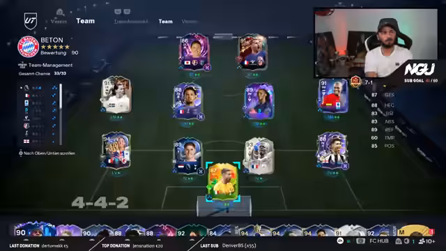 01:32:39Nach intensiver Sichtung der Spieler des Fantasy Teams 2 zeigte sich der Streamer überraschend positiv beeindruckt und fühlte sich getäuscht, da das Team als besser erschien als erwartet. Er überdachte daraufhin seine ursprüngliche Planung, keine Packs zu öffnen. Stattdessen erwog er nun, ein paar Packs zu öffnen, um seinen Verein zu füllen und Spieler für die Ori-SBC zu beschaffen, da nur noch wenige Zeit dafür bleibt.
