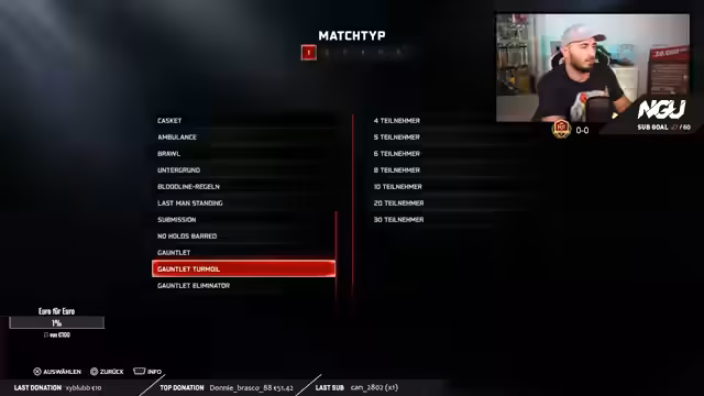 02:58:42Nachdem das Spiel geladen ist, gibt der Streamer einen detaillierten Einblick in die Gameplay-Features. Er erklärt die verschiedenen Moves, Finisher und die Energieleiste. Anschließend experimentiert er mit der Erstellung von Online-Matches und zeigt, dass es neben klassischen Ladder-Matches auch spezielle Modi wie 'Gauntlet' und 'Battle Royal' gibt, was die Möglichkeiten für die zukünftigen Community-Spiele enorm erweitert.