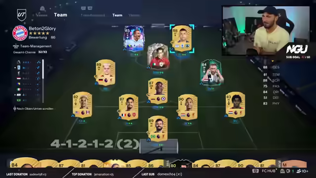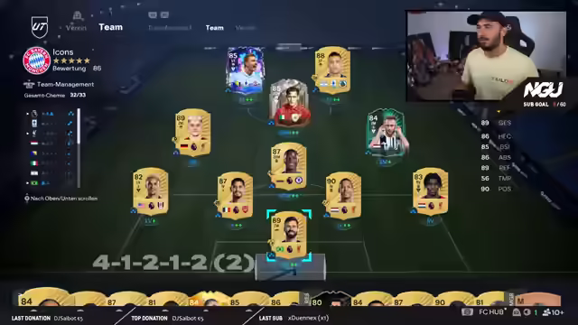 00:12:51Es wird über die aktuelle Division in Rivals gesprochen, Division 4 auf dem Main-Account und Division 5 auf dem RTG-Account. Auf dem RTG-Account gab es nur wenige Niederlagen auf dem Weg durch die Divisionen. Es wird das Team des Main-Accounts vorgestellt, das noch nicht so stark ist, aber Potential hat. Dzeko ist im Team und Kockenmeiners, sowie Totti, der gezogen wurde. Martinez wird getestet. Der Streamer wünscht sich Gameplay und kündigt an, dass es heute nur Gameplay geben wird. Er bedankt sich für die Likes und fordert auf, die 50 Likes auf YouTube zu erreichen, um die Reichweite zu erhöhen. Er spricht über die Möglichkeit, Pro Ladder zu spielen, hat aber momentan viel zu tun und ist mit seinem Output zufrieden. Er erwähnt, dass er an einem Zickzack Dribbling Tutorial arbeitet, da dieses in diesem Jahr wieder wichtiger ist. Er äußert den Wunsch, dass sich das Nationalteam für die WM qualifiziert und betont, dass FC 26 besser ist als FC 25. Er erklärt, wie man Kockenmeiners bekommt, indem man den Moments Modus spielt und fünf Pässe macht. Er kündigt an, dass er morgen ein Pack-Opening mit beiden Accounts machen wird und RTG zocken wird, um Dzeko zu holen.