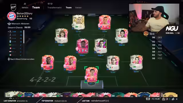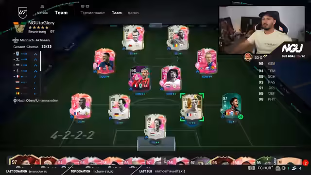 04:48:16Nach langer Zeit hat der Streamer eine beeindruckende Serie von 53 ungeschlagenen Spielen in der Weekend League erreicht. Diese Leistung war entscheidend, um wieder Selbstvertrauen zu gewinnen und seine alte Spielstärke unter Beweis zu stellen. Ziel ist es, dieses Momentum in das kommende Spiel FC 26 mitzunehmen und dort wieder dominant aufzutreten. Die 53 Siege dienten dazu, die Leistung in der Community sichtbar zu machen und das alte, erfolgreiche Gameplay-Feeling zurückzugewinnen.