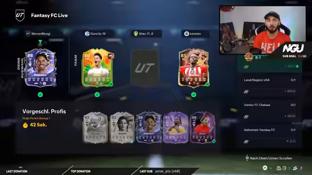 00:09:23Zu Beginn des Streams begrüßt der Streamer seine Zuschauer und stellt seine neue, feste Streaming-Zeiten vor: montags ab 16 Uhr, sowie an den restlichen Wochentagen zu späteren Uhrzeiten. Er kündigt das Hauptthema des heutigen Streams an, die Fantasy-Liga, bei der er mit einem speziell aufgestellten Team antreten wird. Dabei wird die Aufstellung nach klaren Regeln vorgenommen: drei Spieler müssen eine Bewertung von 88 oder höher haben, die Gesamtwertung des Teams darf maximal 83 betragen und Bronze-Spieler sind auf der Bank nicht erlaubt.