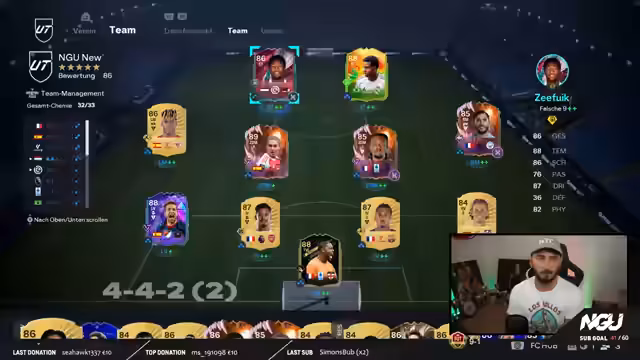 01:40:20Die Umstellung auf das 4-4-1-1 System erweist sich als erfolgreich, da es ein 'anderes Kaliber' darstellt und sowohl offensiv als auch defensiv eine Verbesserung bringt. Die Spieler harmonieren besser, insbesondere Thuram und Mariona im zentralen Mittelfeld. Cefuik blüht im ZOM auf und trägt maßgeblich zum gefährlicheren Spielaufbau bei. Rodrigo wird weiterhin für seine Stärke, Ballsicherheit und sein exzellentes Dribbling gelobt, was ihn zu einer der besten Level-40-Karten macht. Die Frustration über das Gameplay bleibt jedoch bestehen, insbesondere bei Anstoß-Bugs und skriptgesteuerten Situationen, die zu unverdienten Gegentoren führen. Es wird betont, dass man sich nicht zu sehr aufregen sollte, um die Energie für die nächsten Spiele zu bewahren. Das 4-4-1-1 System wird als die neue Standardformation für die kommenden Spiele festgelegt. Es wird eine kurze Pause eingelegt, um sich zu sammeln und die Community zum Liken und Abonnieren auf YouTube und Twitch aufzurufen. Es wird ein 'Sabathon' im Dezember angekündigt, der den streamreichsten Monat in der Geschichte des NG Universe verspricht. Cefuik wird als solider ZOM-Spieler mit guten Werten und Playstyles wie Finesse Plus und Incisive Pass bewertet, auch wenn er auf zwei Chemie spielt. Rodrigo bleibt ein Schlüsselspieler, und es wird betont, dass seine Finesse Plus-Fähigkeit aus der Distanz genutzt werden muss. Die Verbindungsprobleme im Spiel werden als störend empfunden, was zu unglücklichen Toren führen kann. Die Schwierigkeit, den richtigen Spieler anzuwählen, und die damit verbundenen Gegentore werden kritisiert. Die Leistung von Cherki wird hinterfragt, da er oft den falschen Fuß für Schüsse verwendet, was zu verpassten Chancen führt. Die taktische Umstellung auf 4-4-2 wird als effektive Methode zur Spielverwaltung und Verteidigung genutzt. Thuram und Cherki werden als nächste Baustellen identifiziert, während Cefuik weiterhin als sehr präsent und gefährlich im ZOM gelobt wird. Rodrigo wird als fantastische Level-40-Karte hervorgehoben, vergleichbar mit dem Haaland von vor zwei Jahren. Der Streamer ist zufrieden mit der Leistung des Teams und den erzielten Toren, wobei Rodrigo und Cefuik mit ihren Finesse-Schüssen überzeugen.