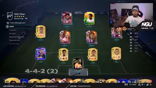 02:47:10Der Streamer steht aktuell bei 8-0 in der Weekend League und plant, alle verbleibenden sieben Spiele noch im aktuellen Stream zu absolvieren. Er betont, dass er sich heute befreiter und besser fühlt als in letzter Zeit. Die aktuelle Taktik ist eine 4-4-1-1-Formation, die in den letzten Spielen sehr effektiv war. Es wird jedoch über mögliche Team-Veränderungen nachgedacht, insbesondere im Mittelfeld. Thuram wird als Schwachstelle identifiziert, da er in bestimmten Situationen zu unbeweglich ist und keine relevanten Playstyles besitzt. Es wird nach einem ZM-Spieler mit 'Intercept'-Playstyle gesucht, der defensiv stark ist und gleichzeitig beweglich bleibt. Namen wie Busquets, De Jong und Valverde werden diskutiert, wobei De Jong als gute und kostengünstige Option hervorgehoben wird.